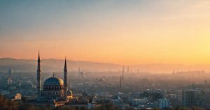 AI generated (Gemini + Flux) featured image for: Yerel Seçim Sonrası Türkiye: Yeni Dönem ve Beklentiler (Prompt: A **cinematic digital painting** image showing **a panoramic view of a modern Turkish city skyline a)